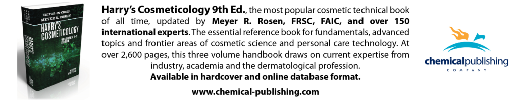 -April 2015- Harry’s Cosmeticology, the most popular book in the cosmetic technical book of all time, is updated by Meyer R. Rosen, FRSC, FAIC, together with over 150 international experts in the essential fundamentals, advanced and frontier areas of cosmetics and personal care science and technology.